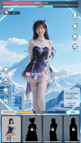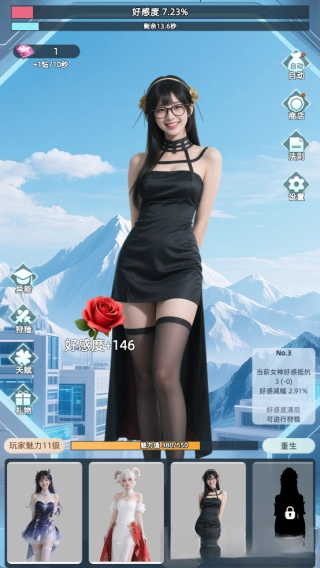 1.玩家进入游戏后的任务是攻克女神关卡,通过点击屏幕来积累好感度。
