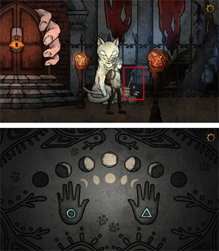 4、继续向右行进,把逗猫棒放置在背包内红框标注的位置,以此引出身上发蓝光的猫。接着按照提示将球摆成黑夜、白天、黑夜的顺序,之后把手放在对应的点位上,门便会开启。