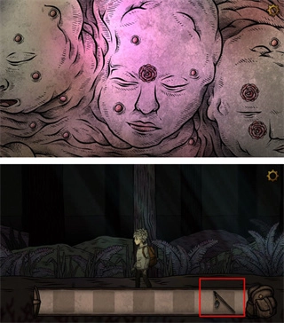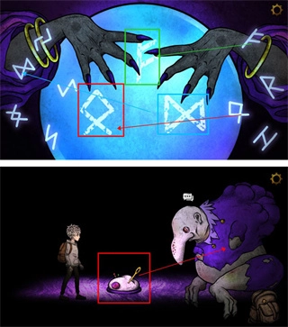 2、玩家在柜子里醒来后向右行进会遇到紫衣女人,完成对话后,将符号拖动到对应的魔法球即可进入场景,随后在画面中红框标注的位置取出金针。