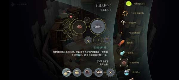 野猪肉料理:由三块野猪肉制作而成,是游戏前期提升体力上限的关键道具,使用一次可增加十点体力上限。