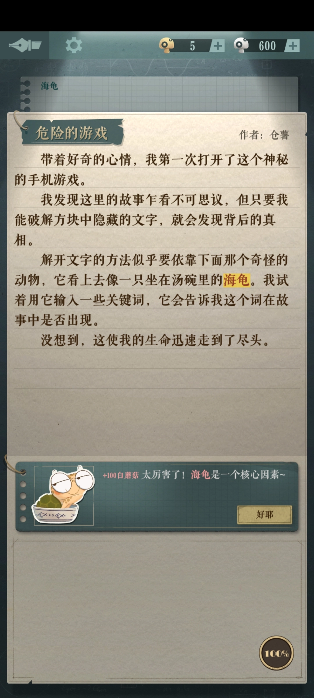 海龟蘑菇汤是一款运用情景推理叙事方式的文字解谜游戏,游戏里的每个情景都会隐藏一部分关键信息,玩家需要在故事的情节中收集并推理出被隐藏部分的信息内容。被隐藏的文字信息分为红色和黄色两种类型,红色的文字信息会直接影响整个故事的走向,黄色的信息则能协助玩家推导出剩余的故事内容。海龟蘑菇汤目前推出了多个故事完全不同的关卡,并且还在持续更新,使得玩家每次进入新关卡都能面对一个全新的故事脉络。要是觉得有难度,游戏还设置了提示系统来帮助玩家更快找到真相,喜欢的话就赶紧来体验游戏吧!