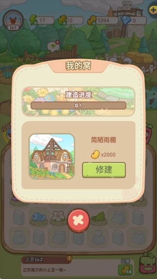 4、当豆子积累到2000颗时,就能修建“简陋雨棚”,进而一步步升级自己的家园建筑。