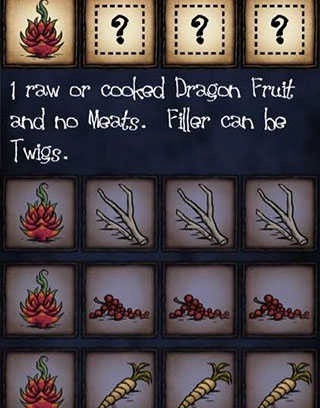 1个火龙果搭配3份填充物,填充物可以用树枝但不能是肉类,这是一份相当不错的食谱。它的搭配方式灵活自由,保质期也比较长,属性表现出色,还带有一定的升温效果。