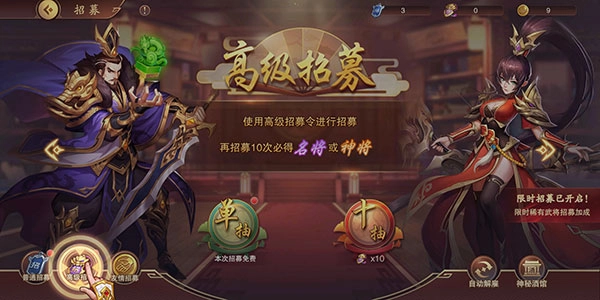 4、如果是十连招募,则必得神将级别的武将。