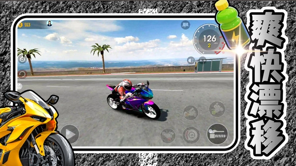 1、玩家能够操控摩托车进行驾驶,体验风驰电掣的骑行快感。