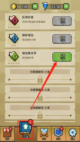 4、闯关中获取到的金币奖励可以在训练中提成角色初始属性