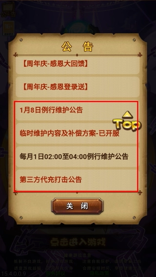 4、在公告中查看维护相关公告,包括临时维护补偿、例行维护时间及第三方代充打击公告等信息。
