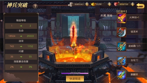 使用对应图纸与突破石启动进阶流程后,系统将进入八小时的神兵锻造阶段,待该阶段结束,神兵即可完成进阶。若想省去等待时间,主公也能消耗元宝触发快速锻造机制,立即完成整个进阶过程。