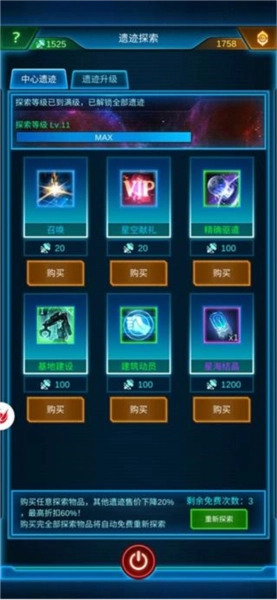 五、每日拥有5次免费刷新星海奇观的机会。星海奇观内包含中心遗迹与黑洞遗迹两大板块:在中心遗迹中,你可消耗模组兑换对应的技能以及“星海结晶”,与此同时,这些消耗行为还能推动黑洞遗迹的进度条增长;当进度条填满时,黑洞遗迹将自动开启,此时你能免费获取一次相关奖励,之后若想抽取黑洞遗迹的技能,则需通过氪金的方式随机获取(经济宽裕且有需求的玩家可以尝试抽取)。 需要注意的是,黑洞遗迹开启后会在72小时后关闭。并且在其开启期间,即便你继续消耗模组,也无法再推进该进度条,这种行为属于资源浪费。因此,合理的模组使用策略是:当黑洞遗迹未开启时,你可以放心消耗模组以推进进度条;一旦黑洞遗迹开启,就应当节省模组,避免不必要的浪费。