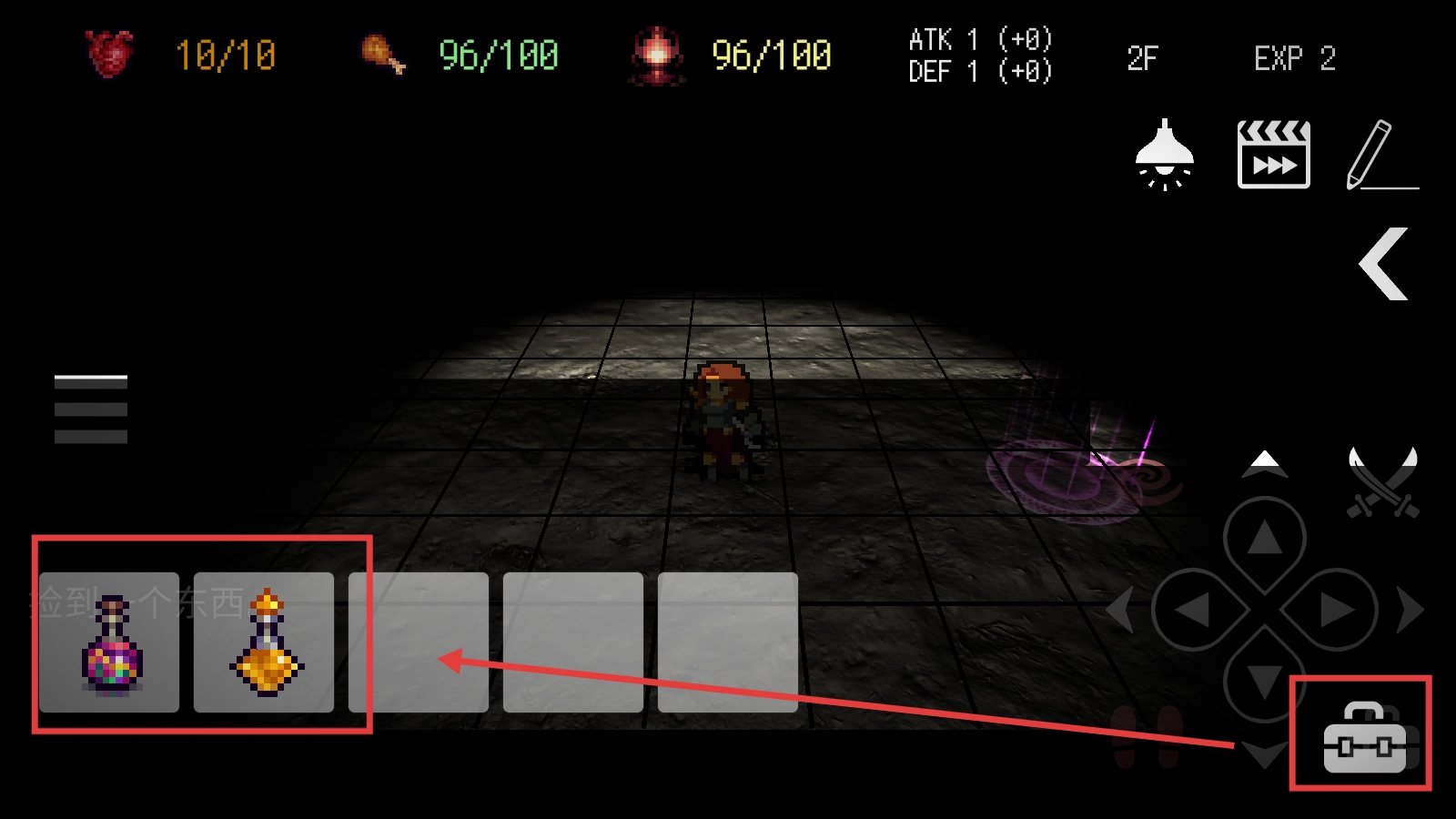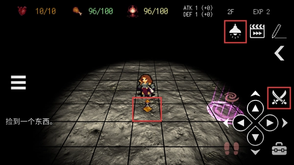 按想要去的方向的按钮移动英雄,面对附近敌人时,按剑上的攻击按钮造成伤害,通过移动和攻击的配合击败地牢中的敌人。