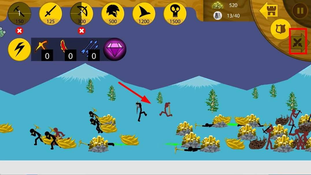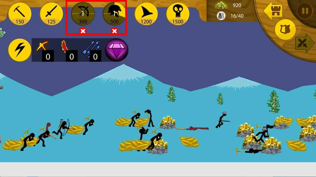 依据战斗需要,点击上方各异的兵种图标,就能召唤对应的火柴人士兵,像弓箭手、持盾战士之类,增强我方战斗实力,帮助获取胜利。