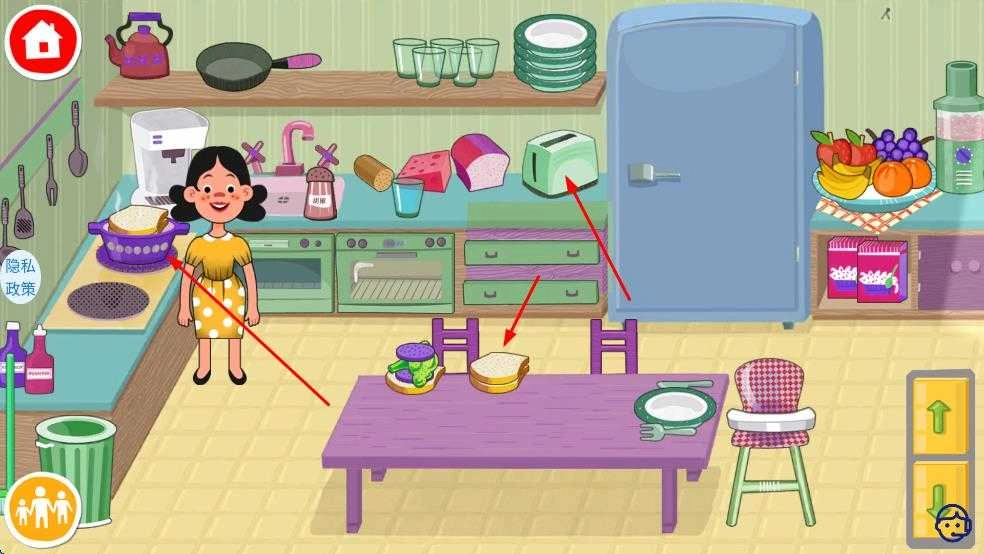 在厨房和角色进行互动,搜寻所需物品,操控烤面包机之类的厨具,完成与烹饪相关的任务以推动流程进展。