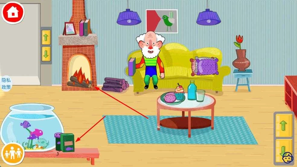 在客厅里和老人互动交流,帮忙整理各类物品,还可以探索壁炉、鱼缸这些区域,通过收集线索来解锁更多新的内容。