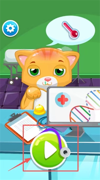 通过拖拽方式操作听诊器、体温计这类基础诊断工具,依据仪器呈现的数值来判定宠物的健康状况,并且做好病历记录。
