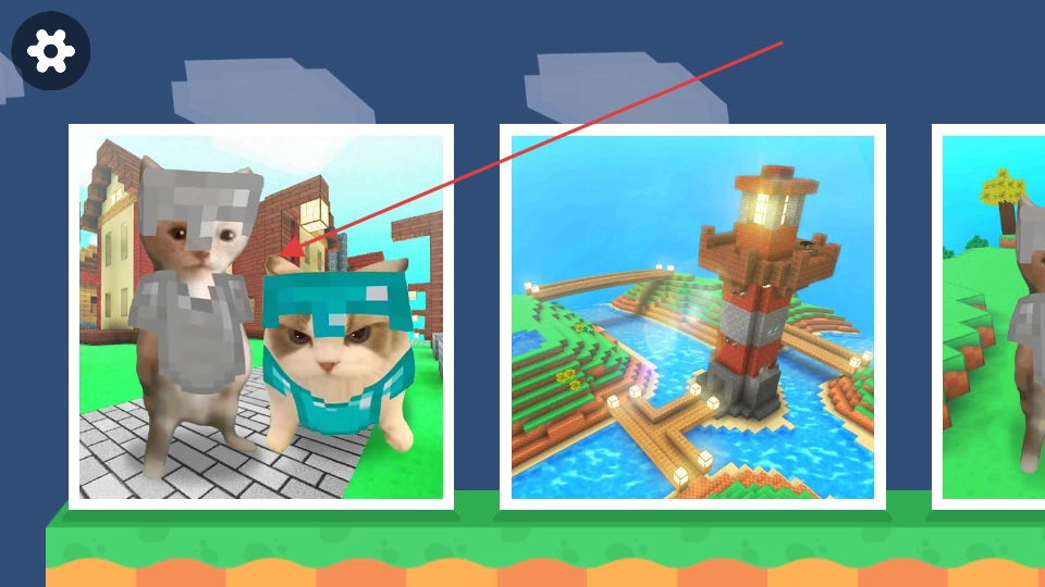 点击左侧那个带有盔甲猫咪的场景选项,就能进入像素风格的建造冒险世界,开启你的游戏体验之旅。