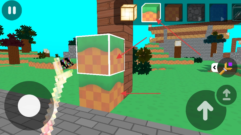 点击右侧的向上箭头按钮,就能让角色跳跃起来,在像素风格的森林和地形里不断前进探索,去发现更多能够互动或者进行建造的区域。
