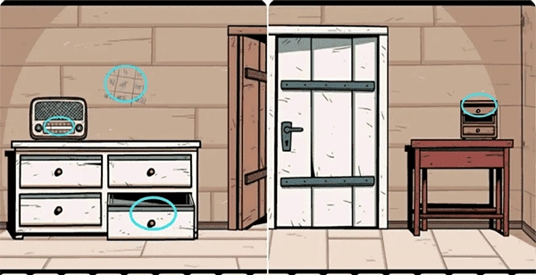 在白色门右侧的抽屉柜中取出两节电池,先将电池装入对讲机,接着把频道调至4收听对讲机播放的音乐,之后点击收音机并将其频道调整为你听到的音乐对应的频道(需记住该频道数字,不同音乐对应不同频道)。
