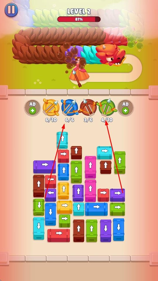 进入游戏关卡后,可点击挑选不同种类的弓箭,借助弓箭射击目标,以此推动游戏进程。