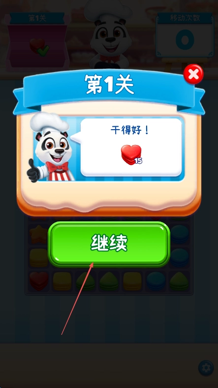 当成功收集到规定数量的目标曲奇后,即可完成当前关卡,点击继续按钮就能进入下一关。