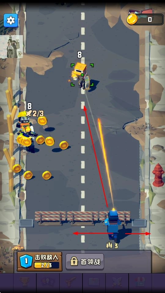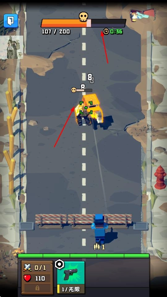 你需要操控角色在道路场景里左右移动,避开各种障碍物,并且要瞄准敌人发起射击。