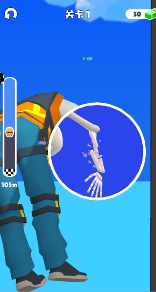通过滑动屏幕来调整火柴人在空中的姿态和运动轨迹,引导它身体的关键部位优先触碰地面或障碍物,以此提升骨骼折断的数量。