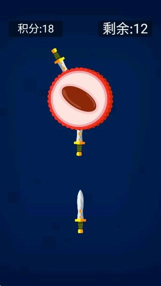 屏幕上会显示各种不同的水果,右上角标注着你需要完成的射击次数。点击屏幕即可发射小刀,击中水果的次数越多,最终获得的分数也就越高。