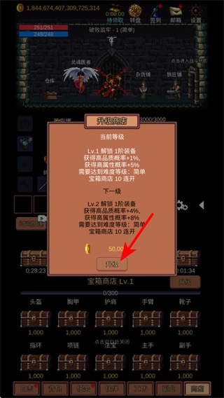 游戏里可以对商铺进行升级操作,升级之后能够提高装备掉落概率、获取概率等相关属性,升级过程中需要耗费一定数量的金币,从而为角色的成长提供助力。