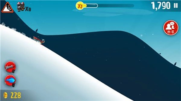 这里提到的加速功能对应的是界面中上方的速度条,其最高可达到x8的八倍速档位。不过需要说明的是,这并非让整个游戏的运行速度提升八倍,而是特指玩家操控角色滑雪时的时速得到了增加,每秒滑行的距离会显著变长。实现加速的途径多种多样:除了借助动物来获取速度加成外,当玩家完成一次完整的后空翻动作时,也能提升一级速度——这种操作通常适合在陡坡区域进行,因为那里滞空时间相对较长;而在成功着陆的瞬间,角色会喷出黄色火花,以此完成这次加速效果的触发。