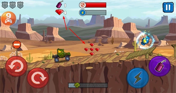在游戏场景里操控车辆行驶,收集钻石类资源,不断累积其数量,以此为游戏的推进过程提供助力。