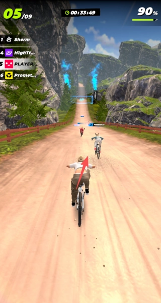 和其他骑手进行速度较量,借助陡坡加速、跳跃点超车等地形优势来拉近差距,在最后冲刺时全力以赴争夺冠军宝座。