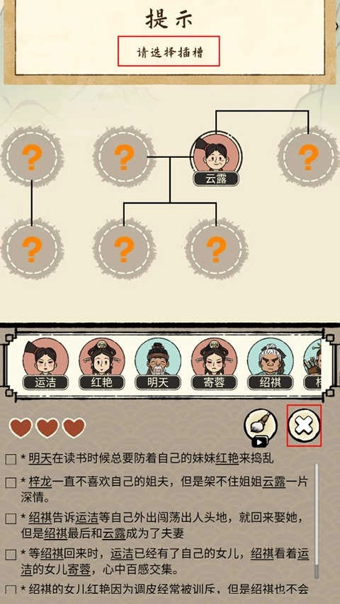 进入关卡后,玩家需依据下方的文字提示,把人物头像拖动到上方对应的圆框里,完成族谱的修缮工作。