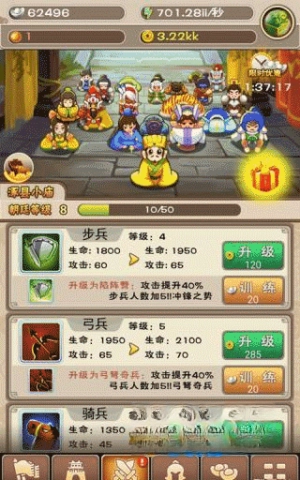 关于兵种升级,在军营中能够对作战兵种进行提升。各个兵种都有其独特之处:骑兵擅长快速突袭,步兵可以提供稳定的输出以及肉盾作用,弓兵则承担远程攻击的职责。主要有两种升级策略:第一种是优先增强骑兵,当资金不够时再去提升步兵和弓兵;第二种是采取平衡发展的方式,让三种兵种之间能够相互支持。