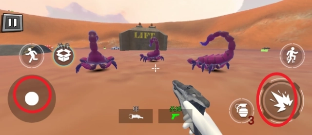 3、通过左侧操作进行移动与跳跃,右侧操作负责瞄准和射击,操控角色在地图中对怪物发起攻击