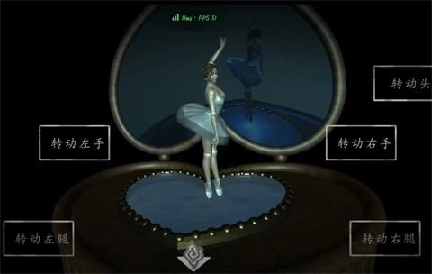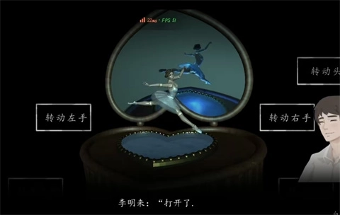 1、调查旁边抽屉发现是锁住的,退出后去卧室脸盆架上取走洗脸盆;回到客厅调查电视,显示没找到旋钮,接着退出调查右边房间进入卫生间;卫生间浴缸里满是血水,用刚拿到的脸盆把水舀出来,里面露出了八音盒;这里需要调整小人偶的动作,使其和镜子中的一致,注意人偶是镜像的,左右要对调,总共要调整三次,依次对应下图所示的动作。