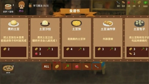 1.煮的土豆:土豆2。土豆沙拉:土豆3胡萝卜1树莓1。土豆饼:土豆4胡萝卜1。土豆油炸饼:土豆3胡萝卜2。土豆包子:土豆3胡萝卜2小麦。