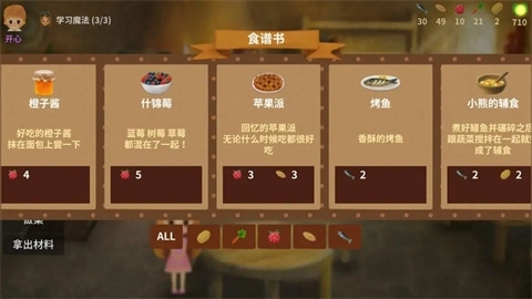3.橙子酱:树莓4。什锦莓:树莓5。苹果派:树莓4小麦3。烤鱼:鱼2。小熊的辅食:鱼2小麦2。