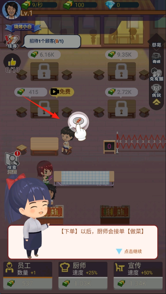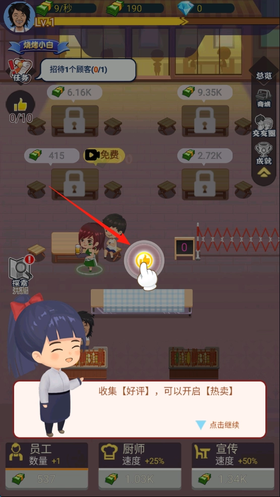 启动资金轻松获取:开局直接获得启动资金用于开设店铺,无需完成任何挑战或任务,就能轻松开启烧烤店的经营之旅,帮助玩家快速进入状态,体验经营初期的乐趣。