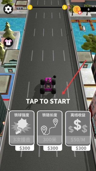 在主界面点击【TAP TO START】,驾驶紫色赛车出发,建议优先升级“铁球强度”以增强撞击力。
