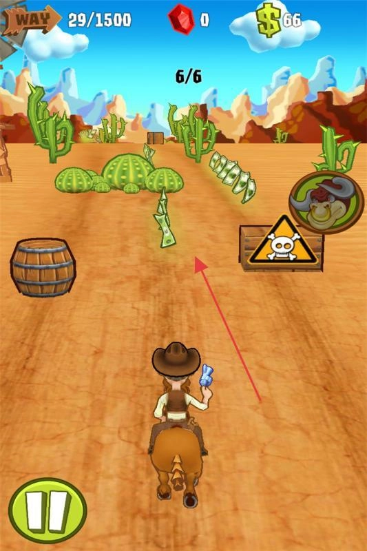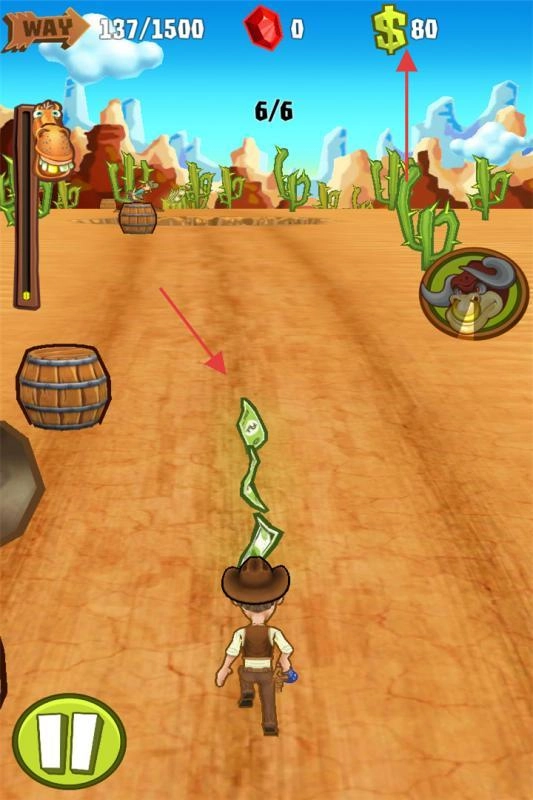 1、控制牛仔沿着西部路线奔跑,通过左右滑动来避开各种障碍,同时收集金币和道具。