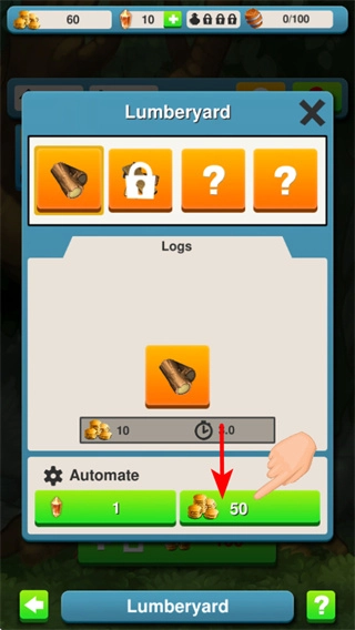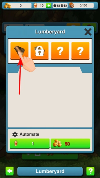 点击金币按钮开启生产自动化功能,这一设置是提高效率的关键操作,完成设置后伐木场就能自动进行生产,从而实现资源的持续获取。