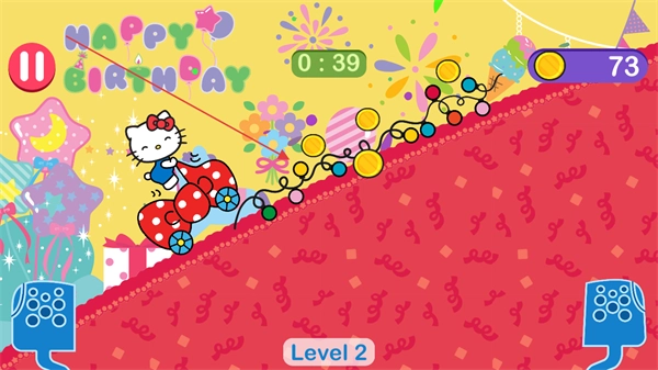 在Level2跑道上,驾驶凯蒂猫小车收集金币,借助彩虹道具获取更多金币。
