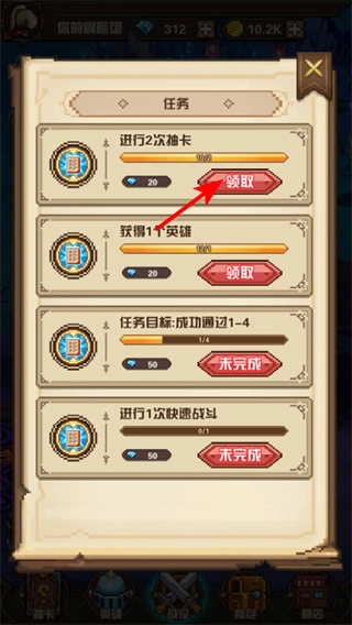在游戏里点击任务按钮就能查看任务列表,完成任务后点击领取按钮,就能获得钻石、金币之类的奖励,积攒这些资源可以帮助冒险团更好地发展。