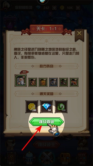 挑战首领即可进入对应的关卡,在进入关卡前,你可以查看敌方的阵容配置以及通关后能获得的奖励,然后结合自己当前的战力情况来判断是否发起挑战,一旦挑战成功就能获取金币奖励。