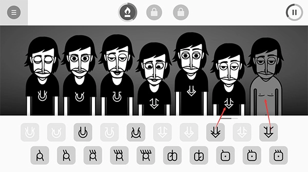 在游戏里,角色的色彩不算丰富,不过定位很明确。游戏界面中间有七个能用来演奏的功能,玩家能借助不同的组合创作出不一样的音乐。游戏的右上角有个暂停按钮,它同时也是节拍器,每转动一圈就表示完成了一个节拍。
