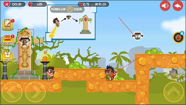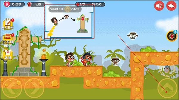 开始游戏后两个人先跳到中间的位置,然后跳到左上角,一人取走一个宝贝。当然如果你的飞行技术好的话可以不往中间的位置跳,直接放两次屁上去。取回宝物后放回祭台。然后往右走。到了这个位置一个人跳到右侧的位置去宝物,另一个人连着放屁2次跳到上面的山洞里面去宝物,如果放屁技术不太好的话可以先跳到右侧的台阶上。