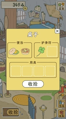 然后我们点击右下角的“房子”图标回到房间,接着在房间里点击左下角的“收拾”按钮,就可以开始为青蛙准备旅行所需的行李了。