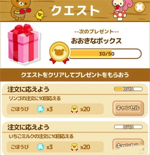 红色宝箱能通过完成每日任务获取,这点设计挺贴心的。每日任务有三个,分别是完成十次订单、生产指定加工品十次。要是不懂日语,可对照仓库里素材的名称来找,难度不大,玩久了对各种物品的日文名也能轻松辨认出来。