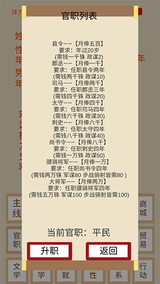 从县令到大将军共有8个职阶,只要四维数值超过一百就能担任大将军一职。从骠骑将军这个职位起,职权就从文官转向了武将,操作时无需在权限界面耗费过多时间,只要满足任务要求,后续就可以不用再关注这方面了。