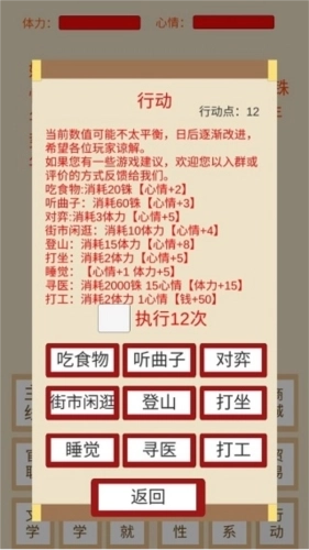 心情与体力:每手动点下一天扣1点体力与心情,数值归零角色死亡。商城流逝丹不扣除数值。