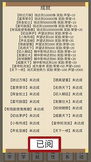 官职、职权、势力与贸易的最终走向,皆与玩家的文学造诣、武学修为息息相关。不同的学习路径与随机事件应对方式,会促使人物属性发生各异的“演变”;而错综复杂的关系网络,同样是左右玩家人生结局的重要因素。至于最终会迎来怎样的结果,则因人而异。